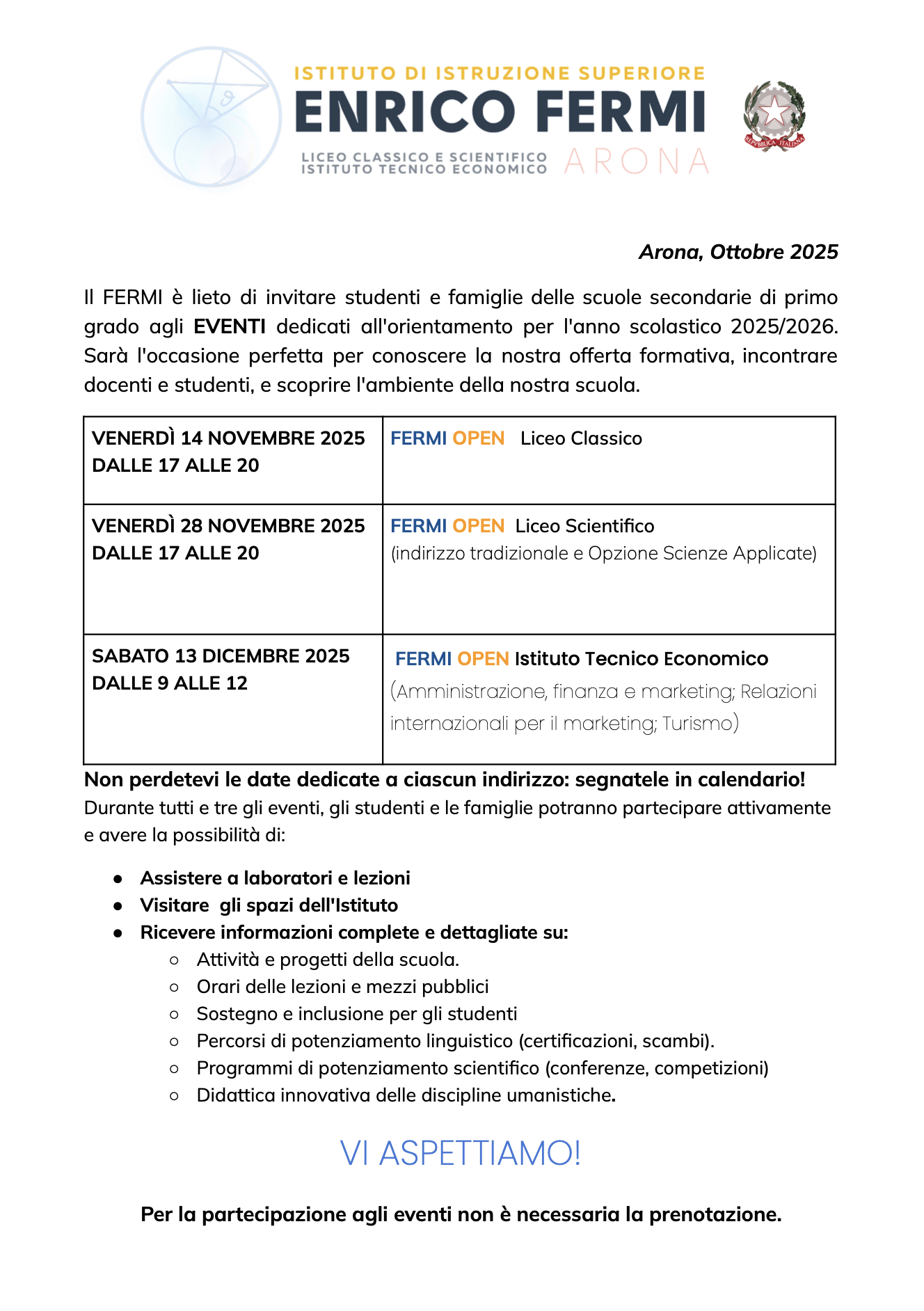 HomeSlide news In primo piano GeneraleFERMI OPEN 2025/2026 FERMI OPEN 2025/2026 Categorie Generale In primo piano Slide news Data: 21/10/2025 Open Day Mobilità 14 Ottobre 2025